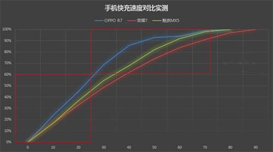 可能很多人发现了这个问题:给低电量的快充手机充电一开始会非常快,但充到一定程度之后到充满这段时间里,充电速度会越来越慢。以速度最快的OPPO R7为例,电量从0到60%用了不到30分钟,但是从60%到100%却用了将近50分钟。